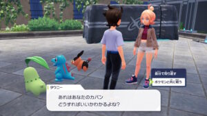 主人公のカバンがヤンチャムに取られた後、最初の3匹「ポカブ」「ワニノコ」「チコリータ」に付いていこう。