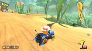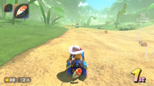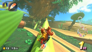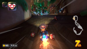 ドングリに当たるとカートがスピンする。ドングリの転がる方向を確認してダッシュボードで逆転のチャンスだ。