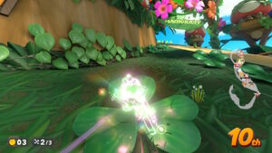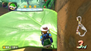葉っぱの上ではジャンプアクションが可能。ツタに乗ると青いミニターボが発生する。