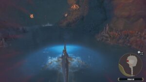 湖上を移動し、オトモンの水上移動で湖の洞窟内を進む。次にミニマップ中央の赤いマーカーを目指しましょう。