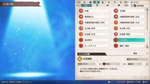 | 孵技:緋の心得 | 20 | 味方全体に会心率アップ。使うたびに効果が累積上昇。 |